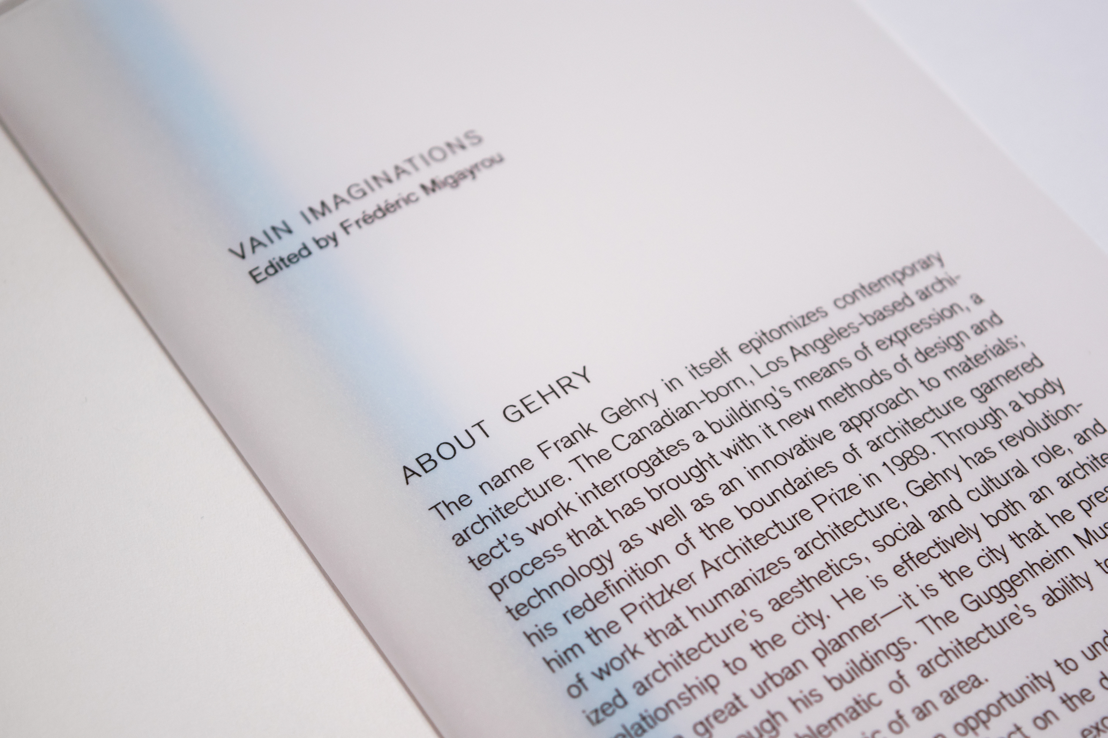Vain Imaginations is an independent book proposal based on the architect Frank Gehry and his works. The book is one of a kind and hand-crafted, perfect bound, and features a vellum dust jacket and vellum pages. I spent around 3 months designing the book, starting from sketches of multiple directions. Then printed and handcrafted crafted the book with a guillotine, binding glue, and wrapped the cover around a hardback board.